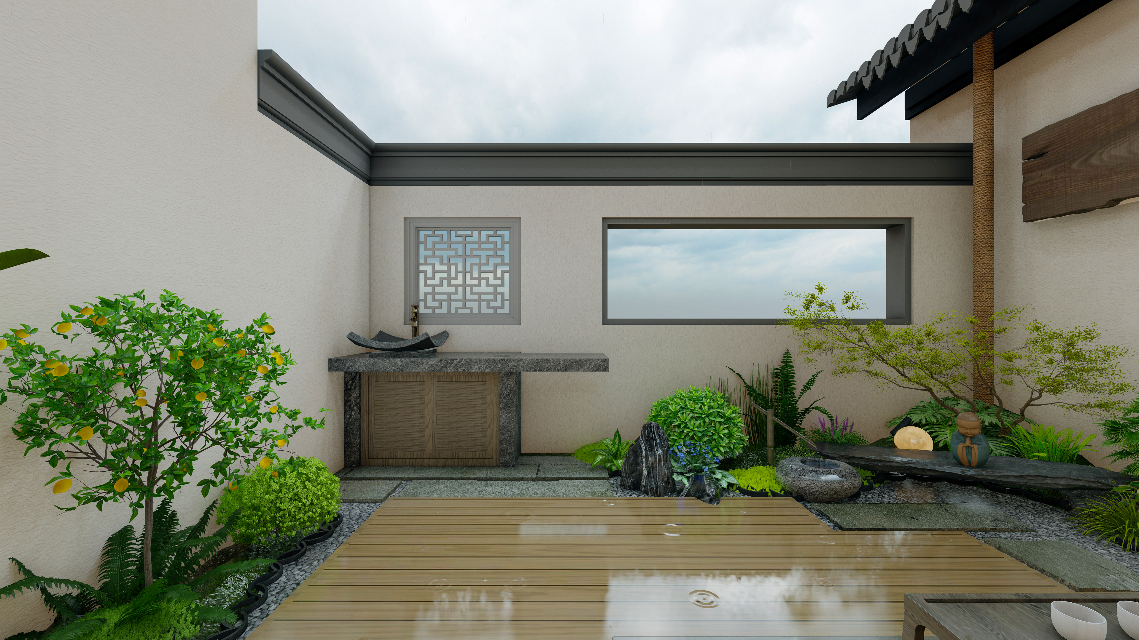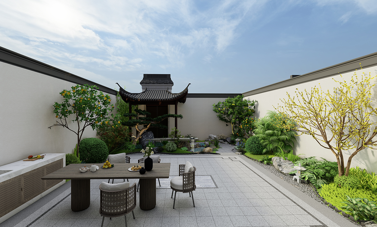 本院设计师巧妙运用传统造园手法,在有限空间内营造出步移景异、意蕴悠长的自然画境。一园三亭,景致各异: 庭院内精心布置了三座不同风格的亭子,分别作为茶亭、棋亭与观景亭,功能与意境兼备,成为园中的视觉焦点与休闲核心。