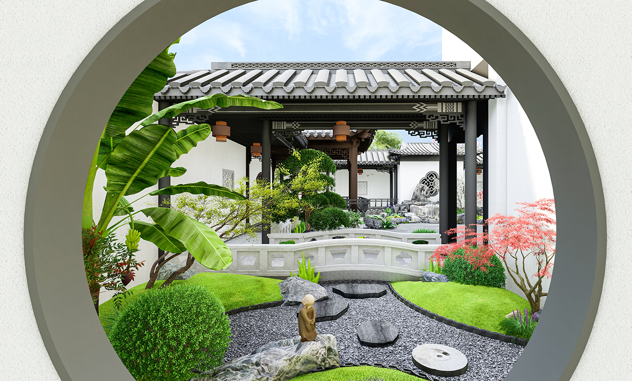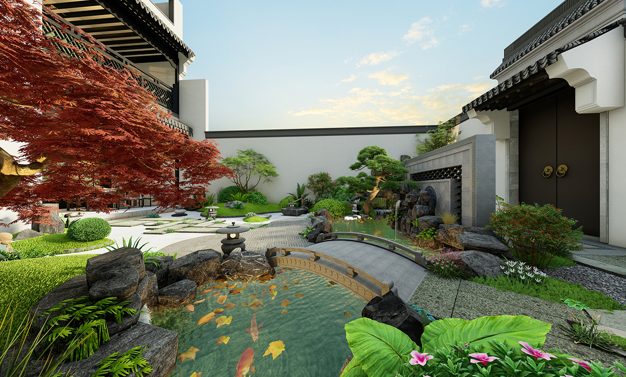 小桥流水,灵动生趣: 一座精致的小桥横跨于浅池或旱溪之上,与水景、山石相映成趣,勾勒出“小桥流水人家”的诗意画面,为庭院注入灵动气息。