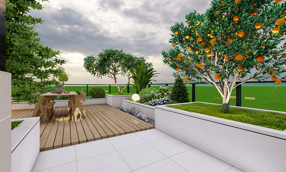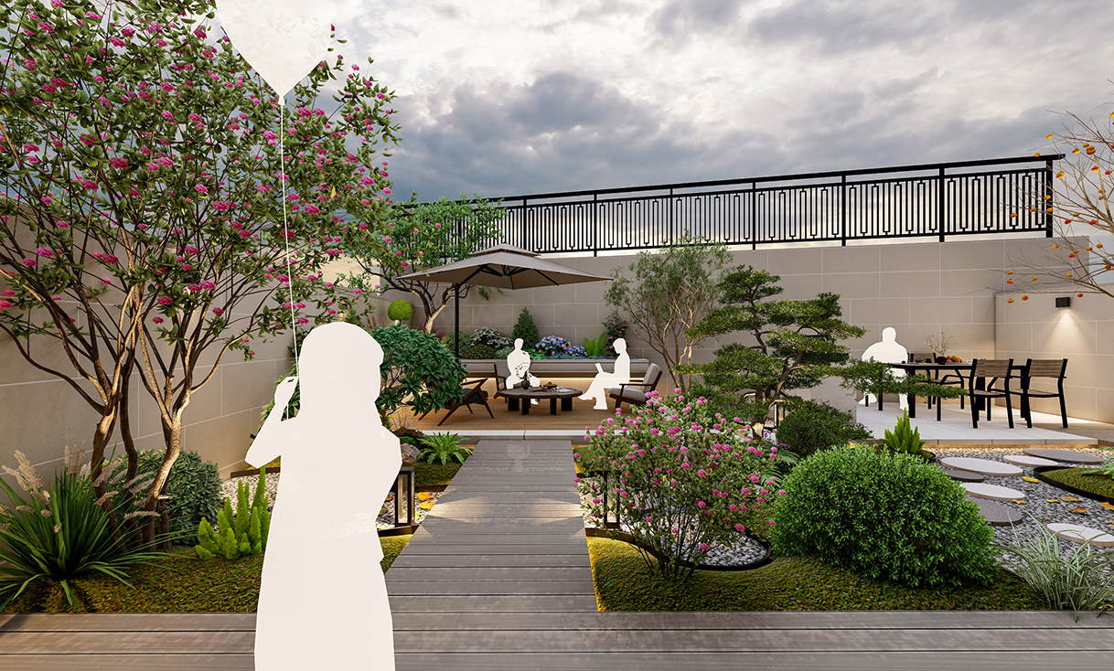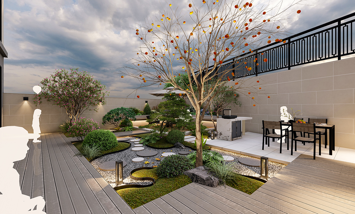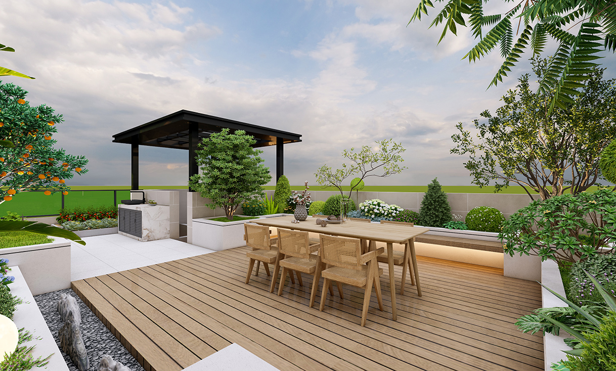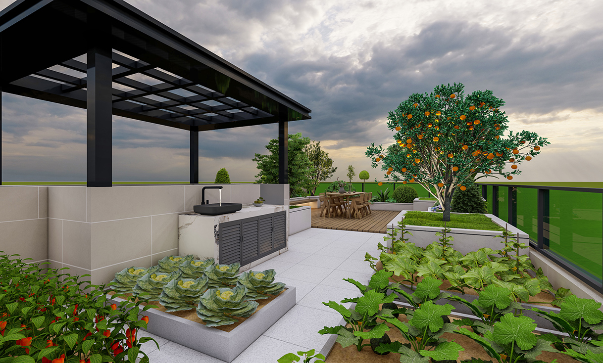 后院则更注重功能性,地面铺设易打理的瓷砖,规划出规整的菜地区域,并配有洗手池与操作台,方便日常种植与料理。尽端的木质休闲平台可作为烧烤区与聚餐区使用,强化了庭院作为家庭社交空间的属性,兼顾美观与实用,于细节中彰显设计巧思。