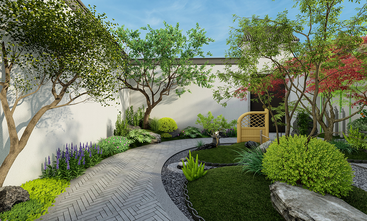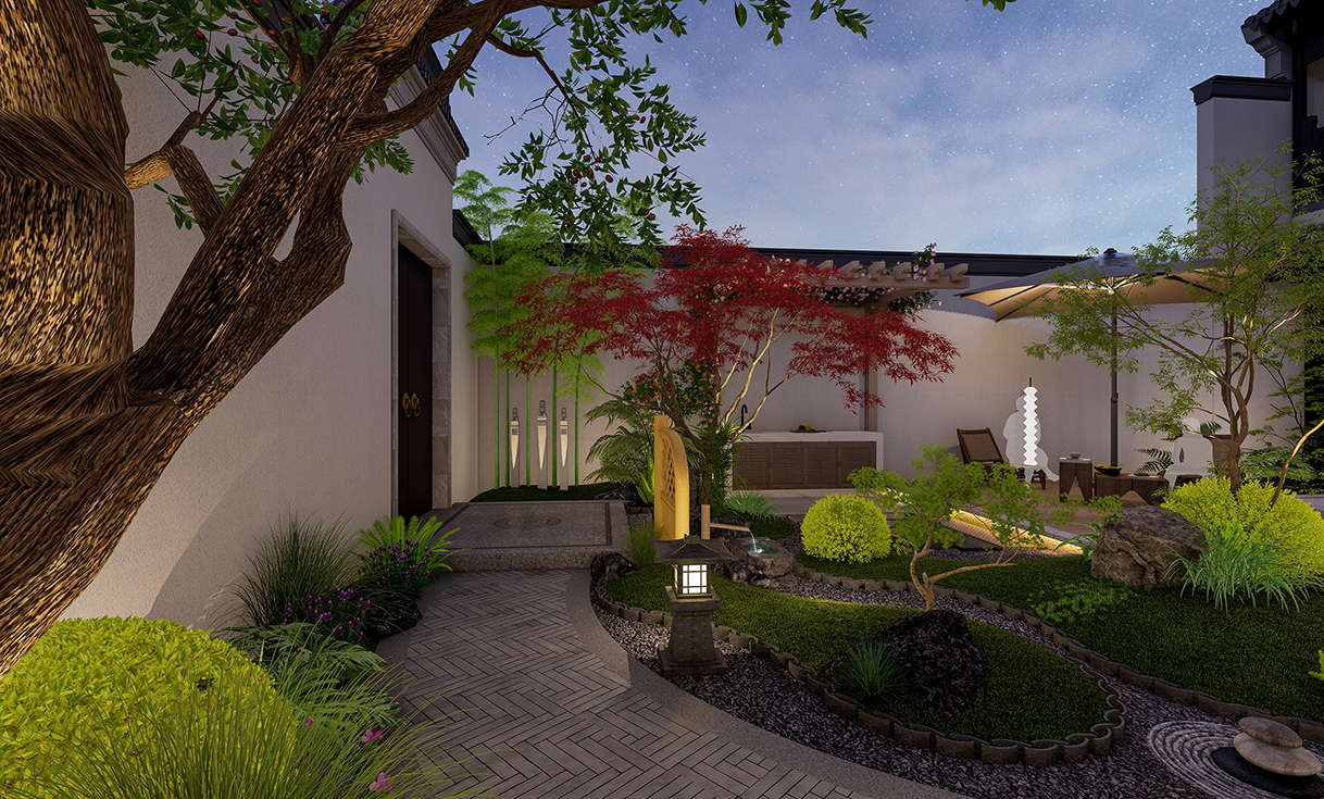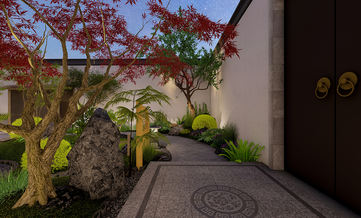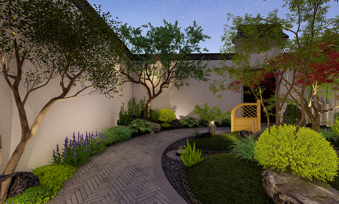 通过照壁和弯曲小径增加花园的趣味同时,保留休闲和功能区更方便聚会和闲空时休憩。