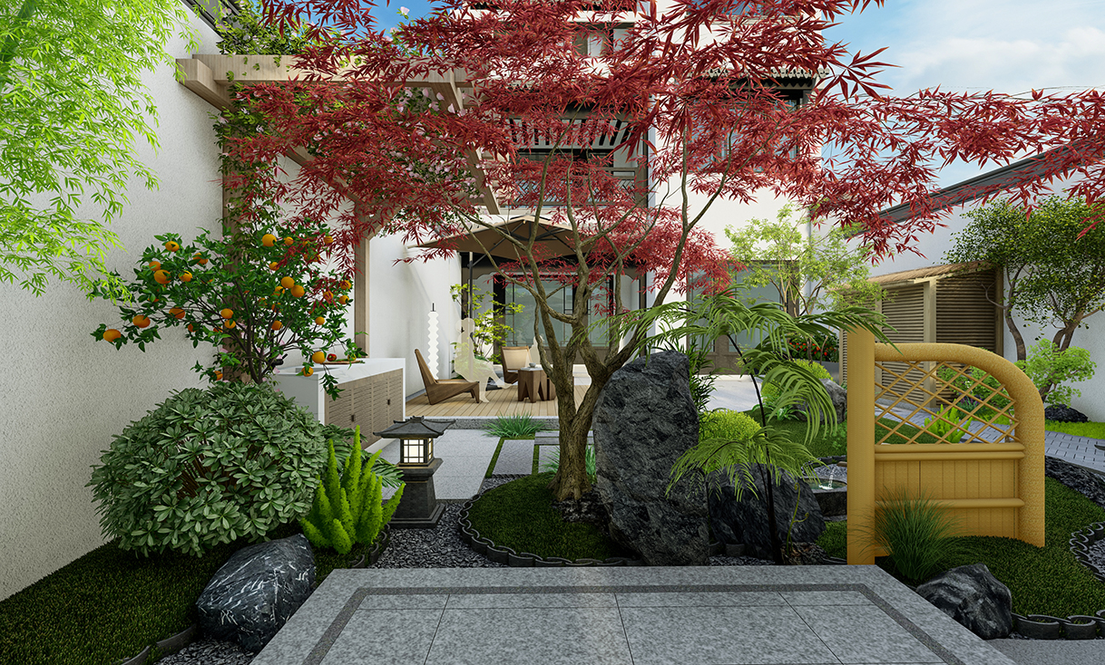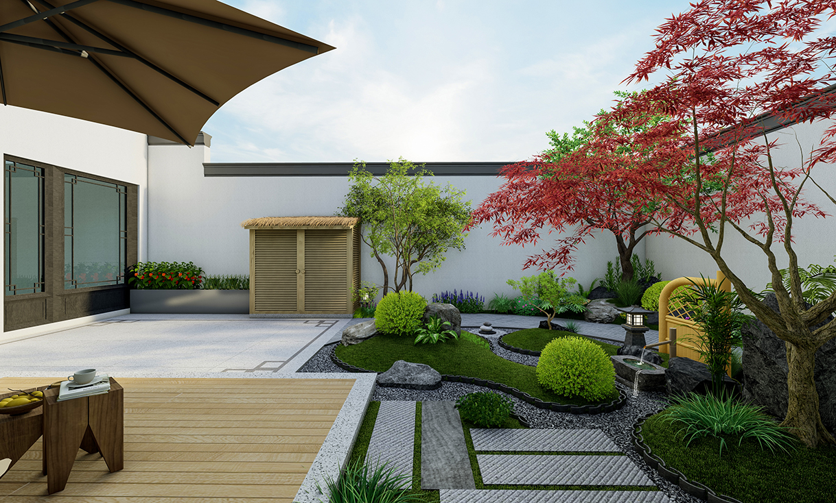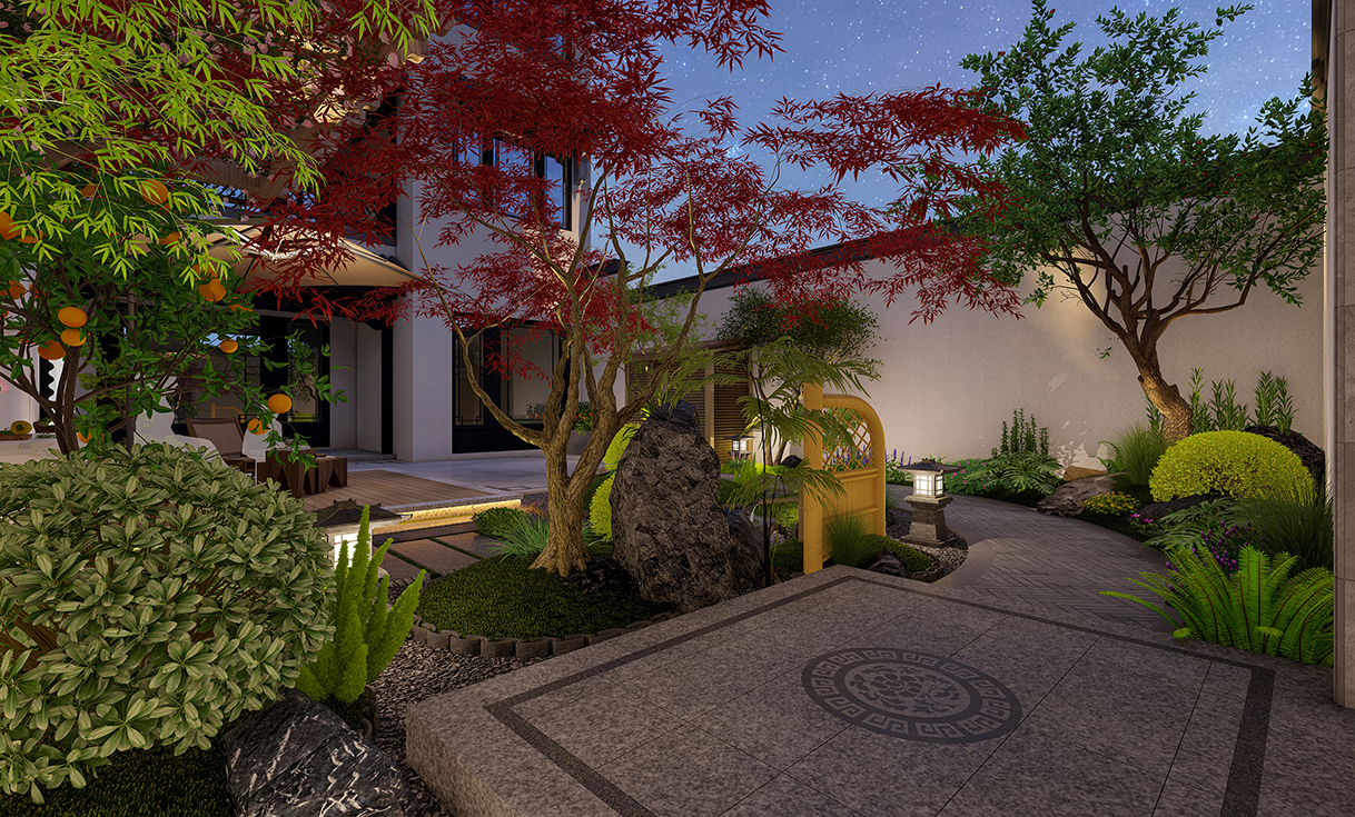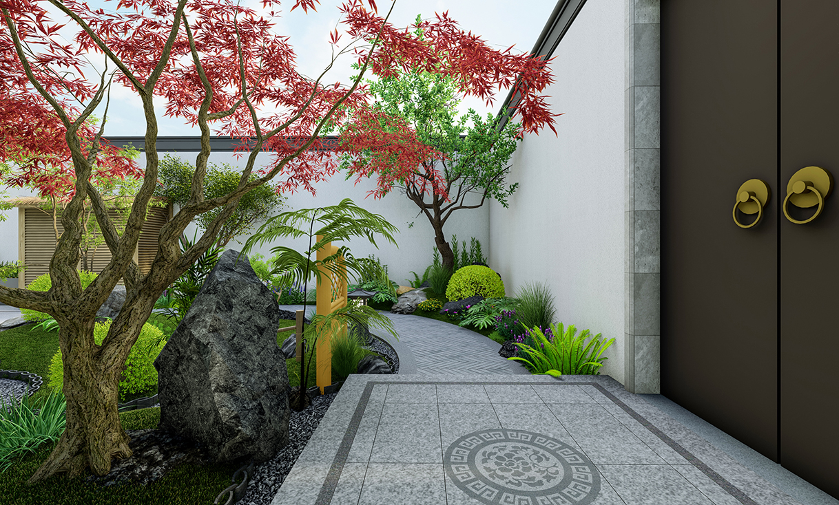 通过照壁和弯曲小径增加花园的趣味同时,保留休闲和功能区更方便聚会和闲空时休憩。