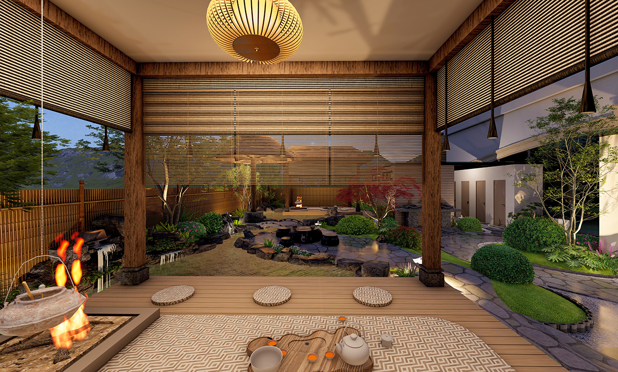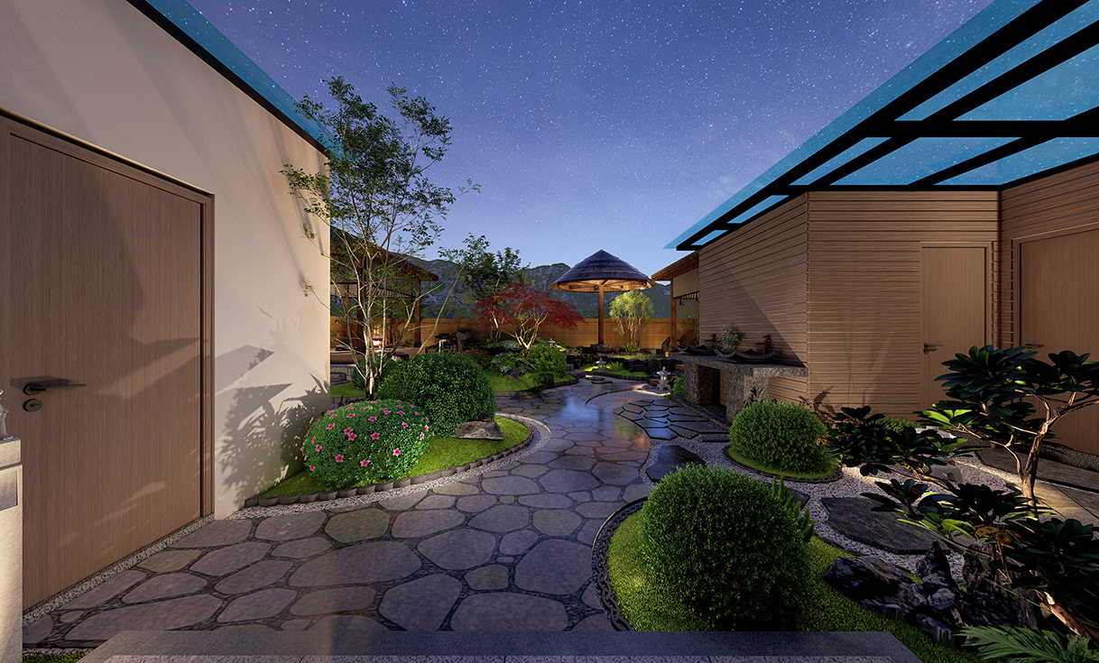 本院设计师巧妙运用传统造园手法,在有限空间内营造出步移景异、意蕴悠长的自然画境。一园三亭,景致各异: 庭院内精心布置了三座不同风格的亭子,分别作为茶亭、棋亭与观景亭,功能与意境兼备,成为园中的视觉焦点与休闲核心。