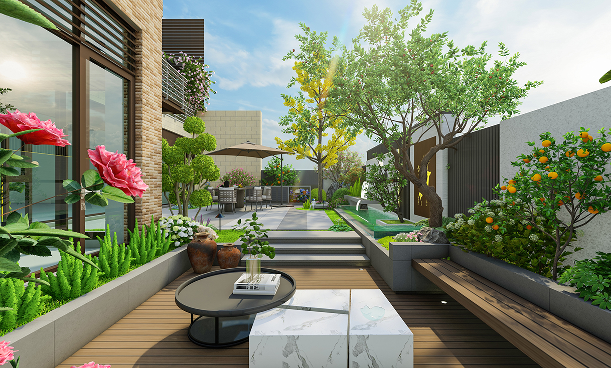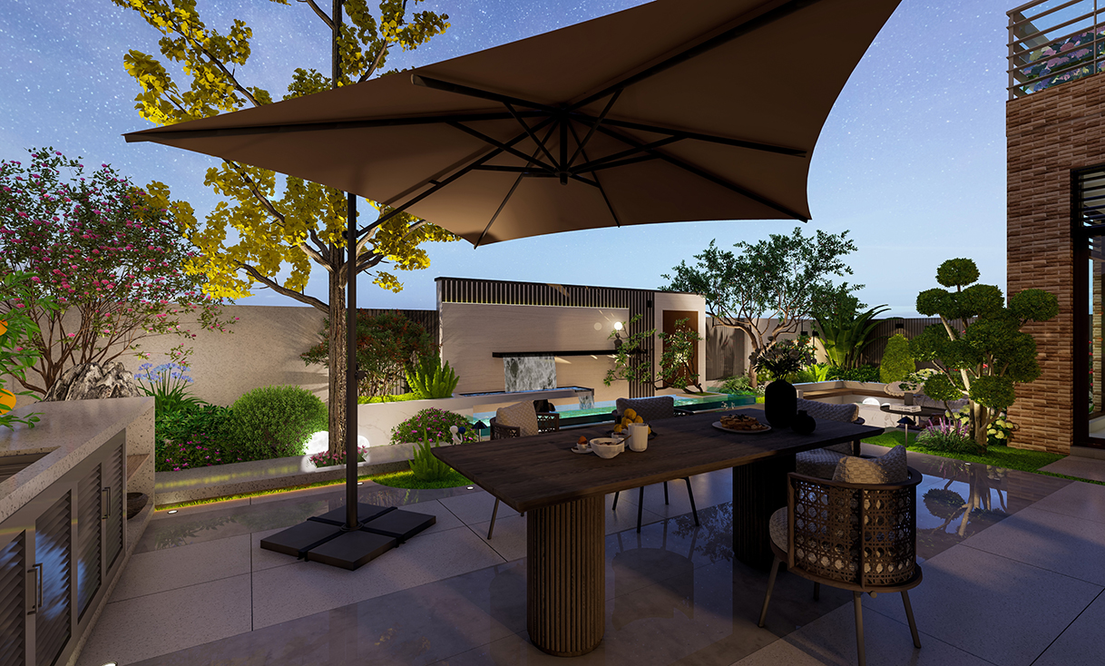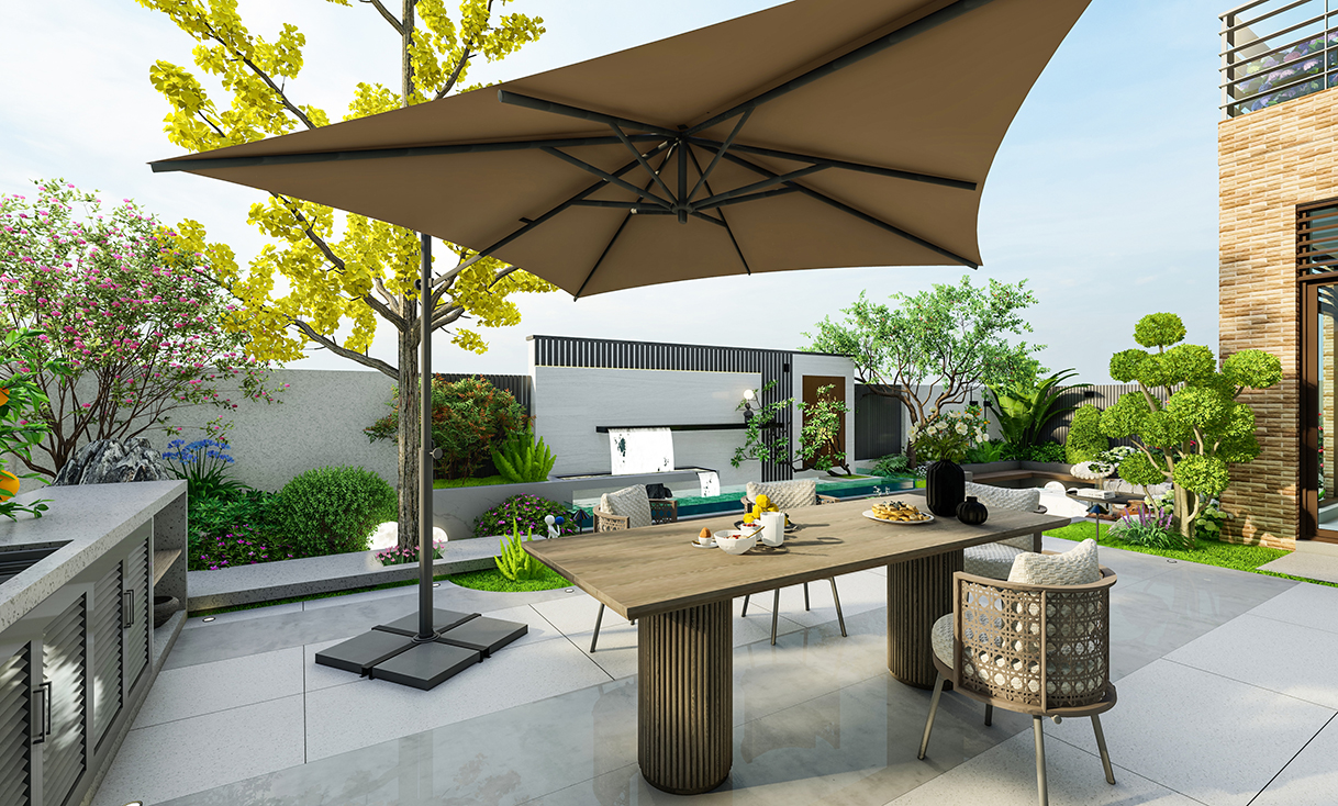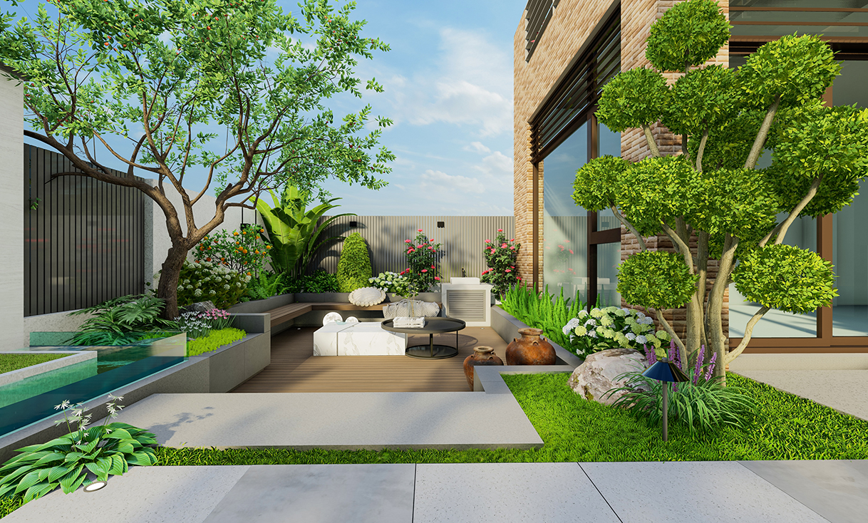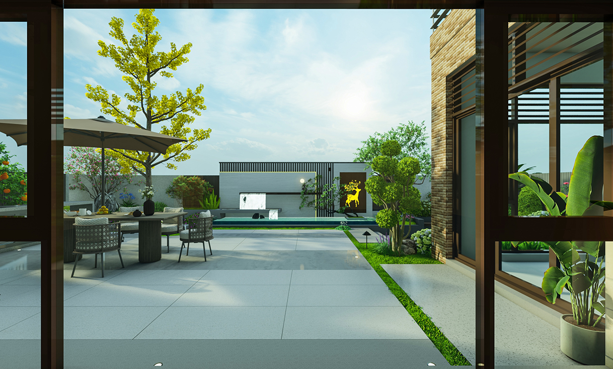 这是一座现代简约风格的休闲庭院。设计以“简洁、易打理”为核心,通过开放布局与精致构景,营造出舒缓的居住体验。